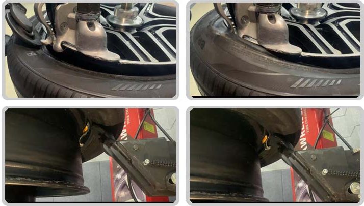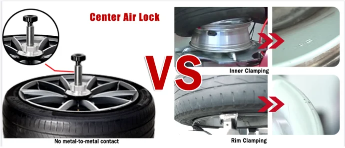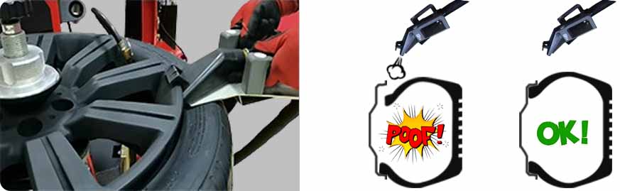 Non-damage tire changer uses leverless tool,disc-bead breaker, and center air lock to achieve the purpose of not damaging the customer ‘s rim. However, many manufacturers on the market do not have truly touchless tire changers (as shown in the left picture). Even if such machines are equipped with center air lock, they still use traditional pressing method because of the existence of a large shovel. Therefore, please be careful to identify such falsely advertised products.